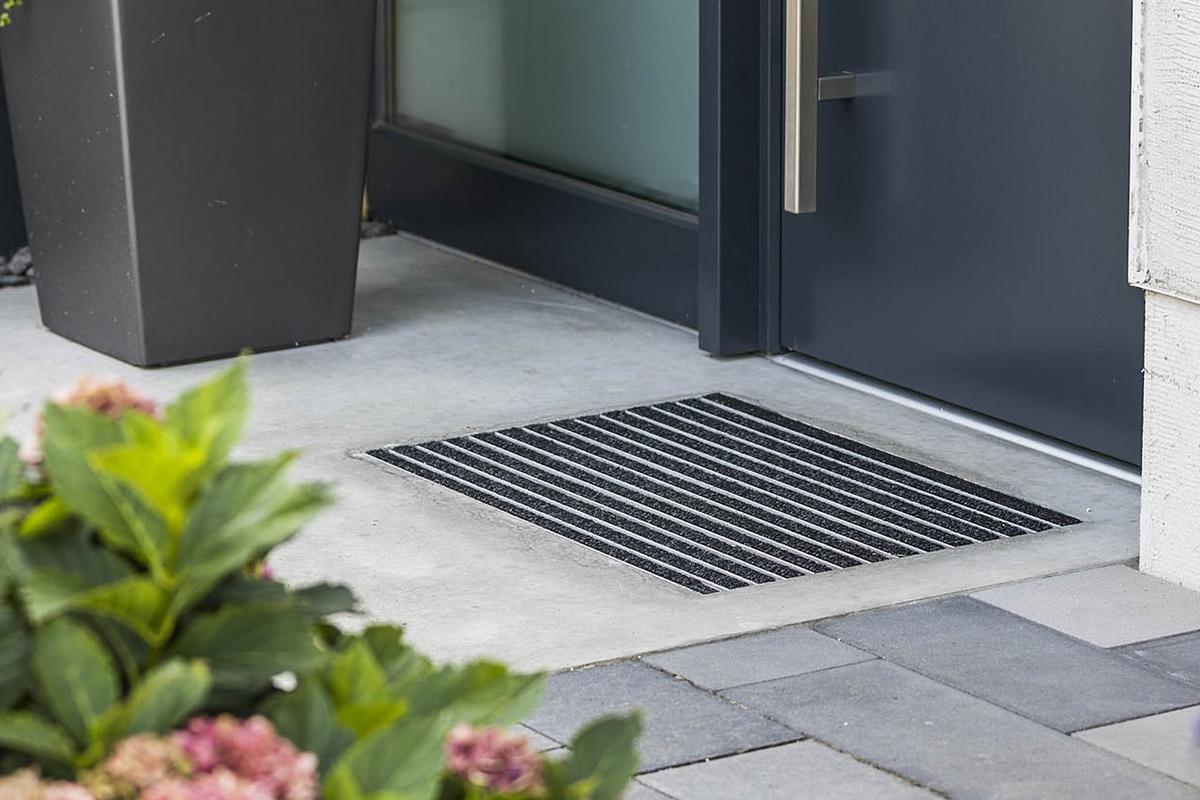 Gitterroste eingelassen in Betonplatten eignen sich besonders gut für Lichtschächte. Trittplatten im Eingangsbereich sind besonders praktisch zum Abfangen von Schmutz.