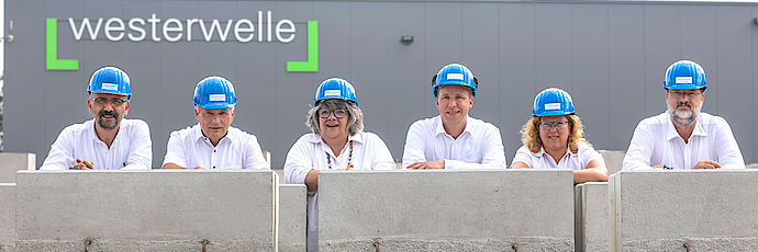 Unterstützend steht außerdem unsere Führungsebene mit ihren Prokuristen und Prokuristinnen in folgenden Aufgabenbereichen zur Seite. (Von links nach rechts) Herr Tamer Kalkan als technischer Leiter, Werksleiter in Herford Herr Bernd Lindemann, Frau Claudia Carini (in Rente), Herr Kai-Uwe Westerwelle selbst, Frau Susanne Voigt im Bereich Buchhaltung und Herr Guido Poßin, Werksleiter am Standort Beeskow. Das Team besteht zum Teil seit einem Jahrzehnt und arbeitet Hand in Hand an der Entwicklung und am Erfolg des Unternehmens!
